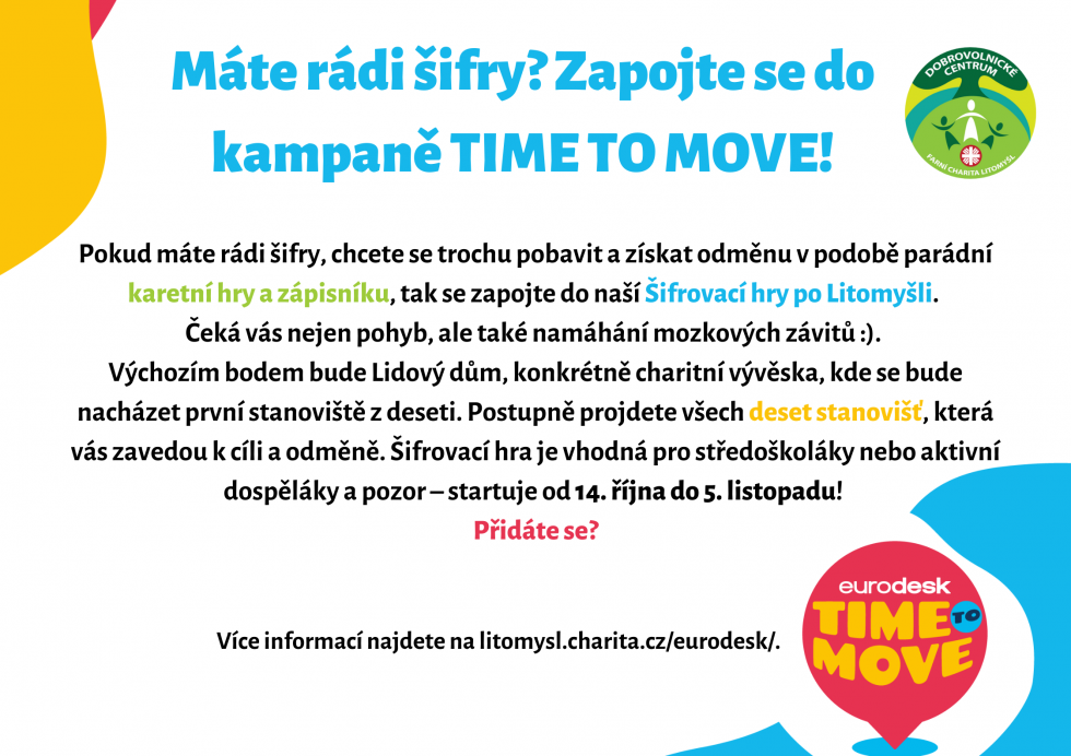 Zapojte se do šifrovací hry po Litomyšli a hrajte o ceny v podobě karetních her a zápisníku. Hra bude probíhat od 14. října do 5. listopadu a první stanoviště najdete u Lidového domu na charitní nástěnce. Pro více informací navštivte stránku litomysl.charita.cz/eurodesk/.