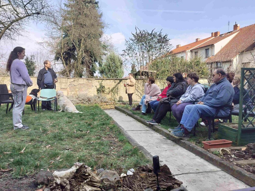 Povídali jsme si o zrakovém postižení, kompenzačních pomůckách, komunikaci i doprovázení a vyvrátili jsme také několik častých mýtů. Besedu doplnily praktické ukázky, jako chůze se slepeckou holí, namazání chleba nebo nalití limonády. Nechybělo ani představení práce asistenčního psa.