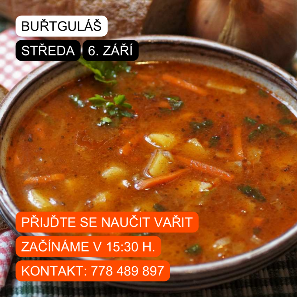 Chtěli byste se naučit vařit? Tak co zkusit třeba buřtguláš? Přijďte dnes do klubu v 15:30 h. a zkuste si ho uvařit. Těšíme se na vás.