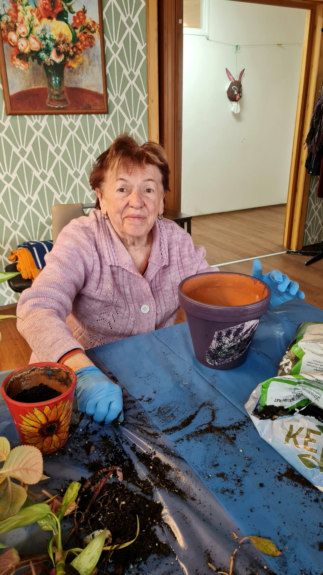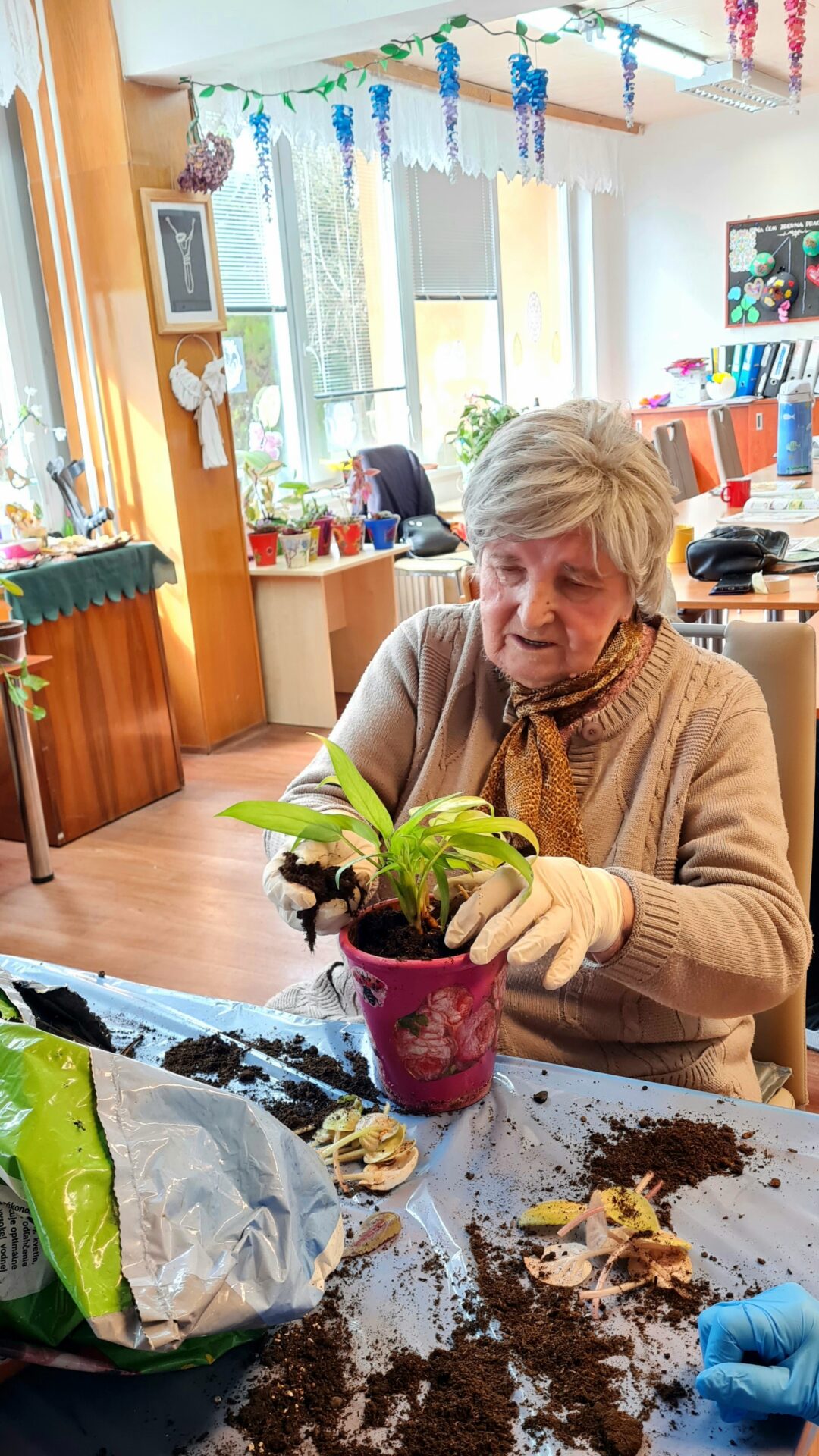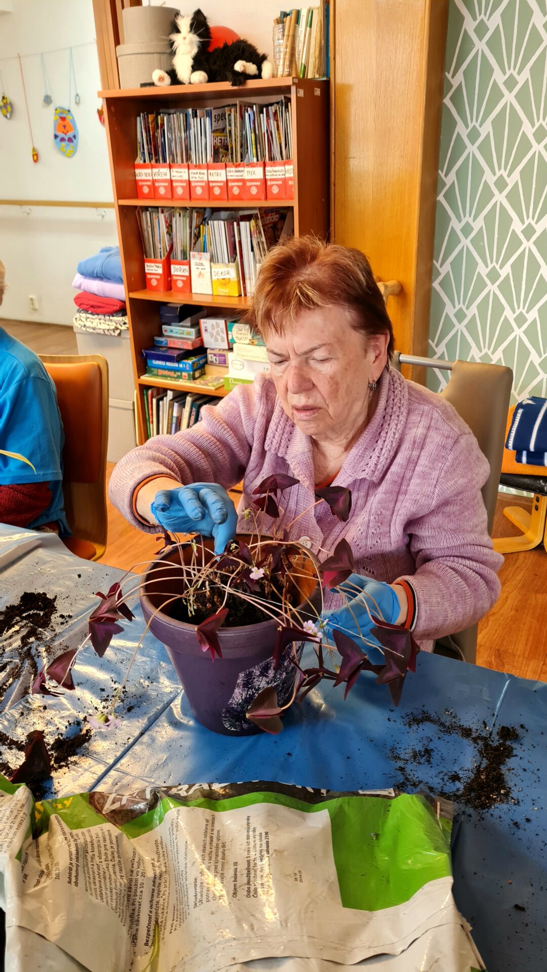 S klienty z našeho denního stacionáře jsme se zaměřili na péči o pokojové rostliny, kterých tu máme opravdu mnoho. Společně jsme rostliny přesazovali do květináčů, které jsme předem natřeli pestrými barvami a ozdobili různorodými motivy pomocí ubrouskové techniky.