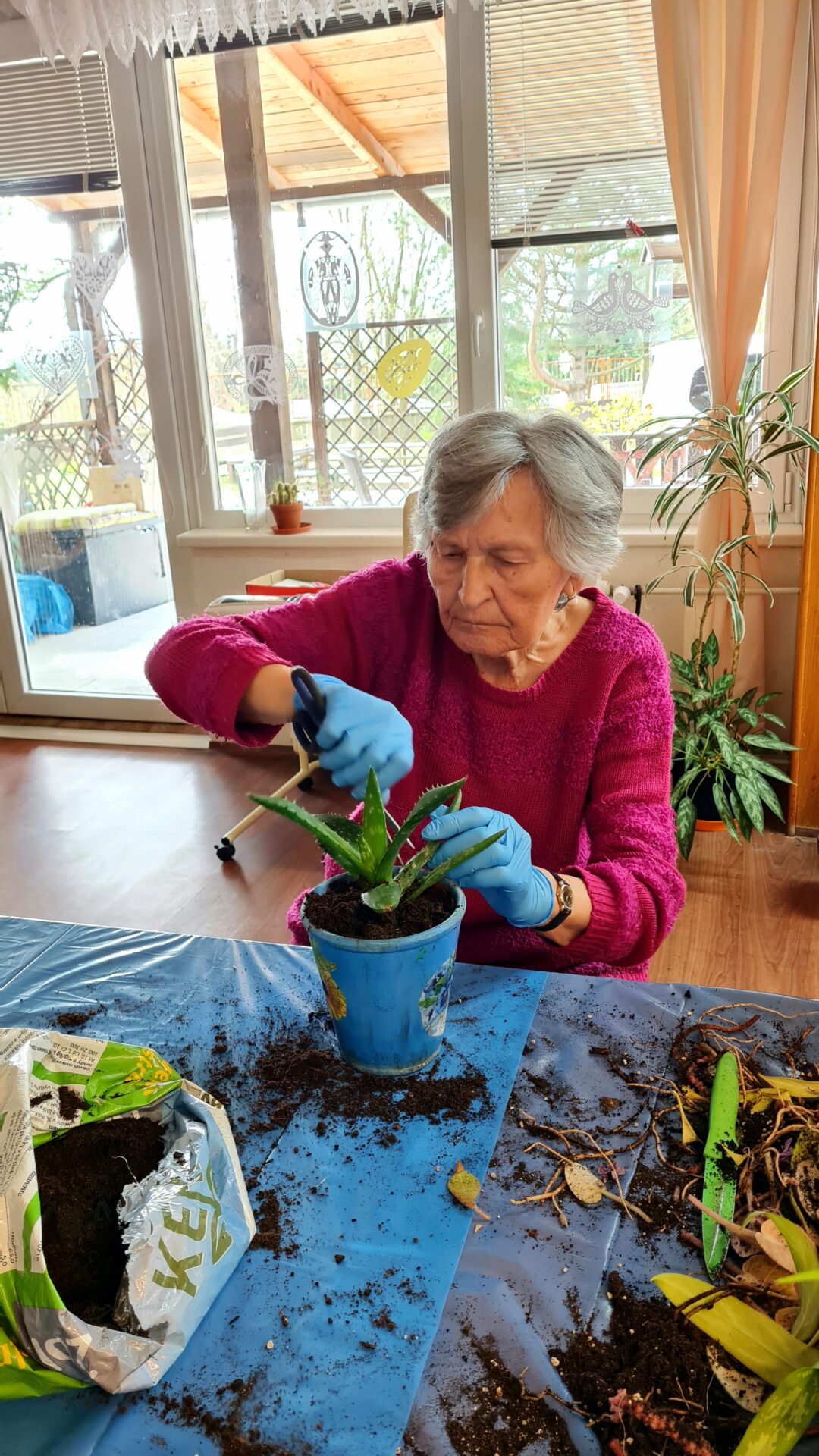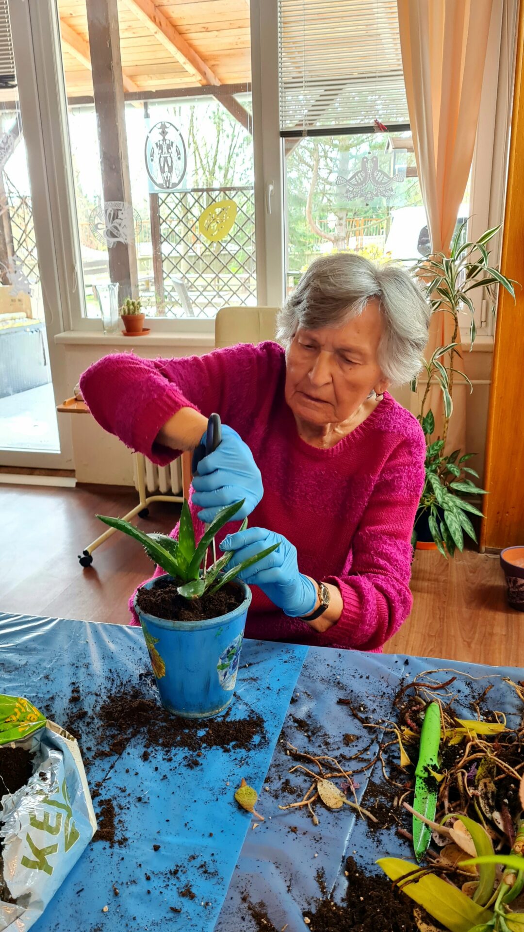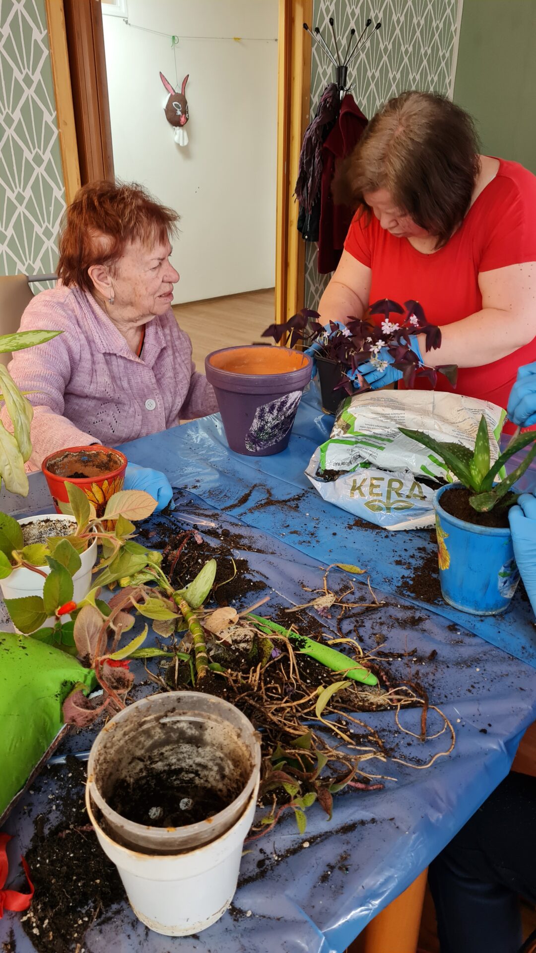 S klienty z našeho denního stacionáře jsme se zaměřili na péči o pokojové rostliny, kterých tu máme opravdu mnoho. Společně jsme rostliny přesazovali do květináčů, které jsme předem natřeli pestrými barvami a ozdobili různorodými motivy pomocí ubrouskové techniky.