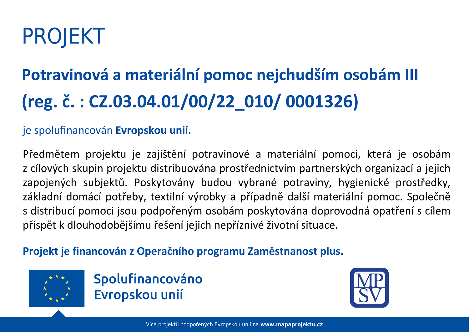 Projekt je spolufinancován z Evropského sociálního fondu v rámci Operačního Programu Zaměstnanost plus (OPZ+) a státního rozpočtu České republiky a pomáhá lidem v tíživých sociálních situacích tím, že jim umožňuje překlenout těžké životní období poskytováním potravinové či materiální pomoc.