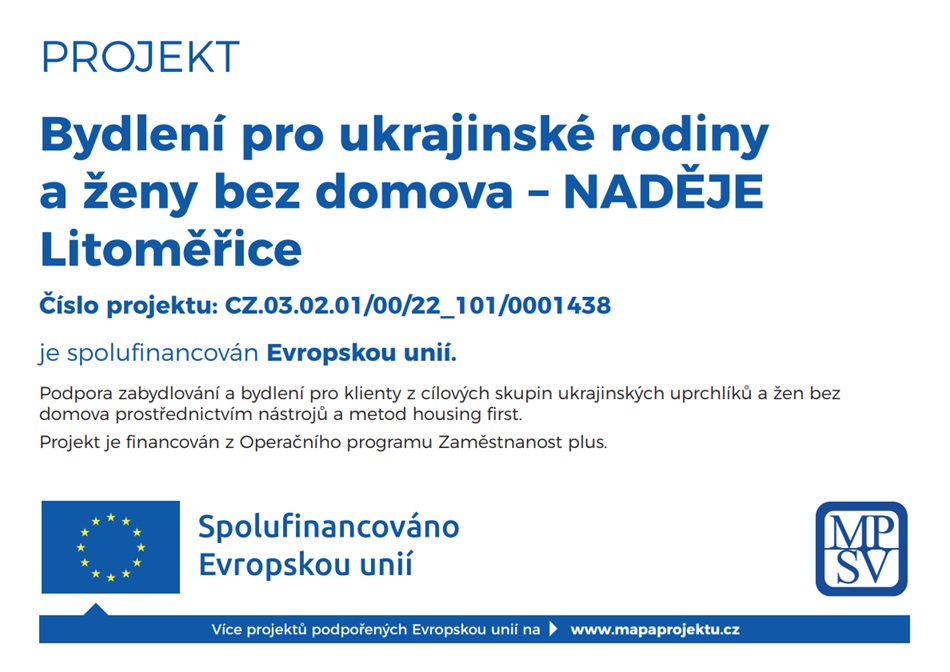 (pdf) Projekt Bydlení pro ukrajinské rodiny a ženy bez domova s registračním číslem CZ.03.02.01/00/22_101/0001438 realizuje organizace NADĚJE Litoměřice v období od 1. 5. 2023 do 31. 5. 2026 a je spolufinancován z Operačního programu Zaměstnanost Plus.