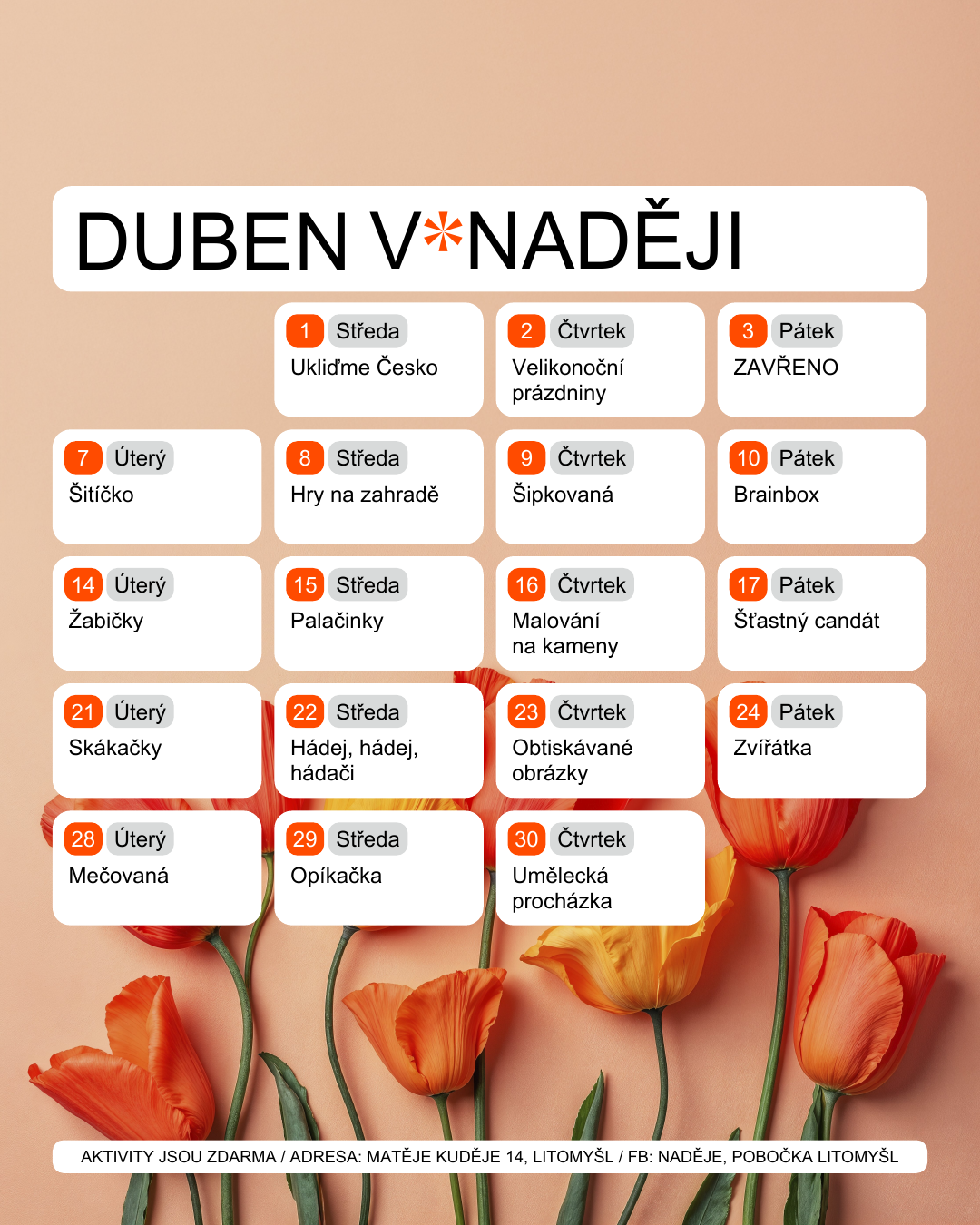 Tohle není APRÍL🙅, tohle je opravdu náš DUBNOVÝ PROGRAM.😅🪻 Určitě je na co se těšit!🤩 Třeba hned DNES je v