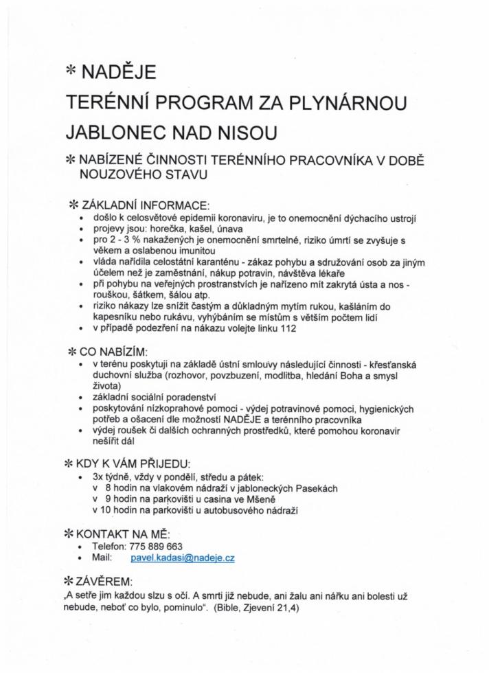 Nabízené činnosti terénního pracovníka v době nouzového stavu.