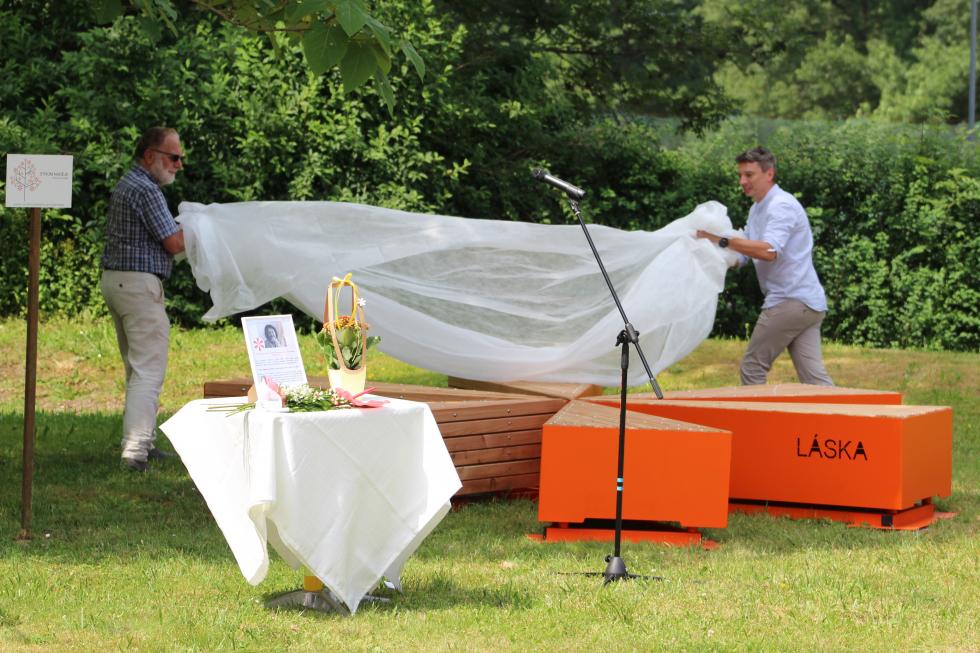 Lavička má však ještě i další symboliku, protože ji tvoří paprsky, z nichž každý představuje jednu z hodnot, které společně tvoří NADĚJI. Její návrh je zásluhou MgA. Jana Pavézky a ing. arch. Jitka Ressové, Ph.D ze studia Ellement a zatím je na celém světě jedinečná. Budou ji moci využít k odpočinku nejen klienti, ale také jejich návštěvy a naši zaměstnanci.