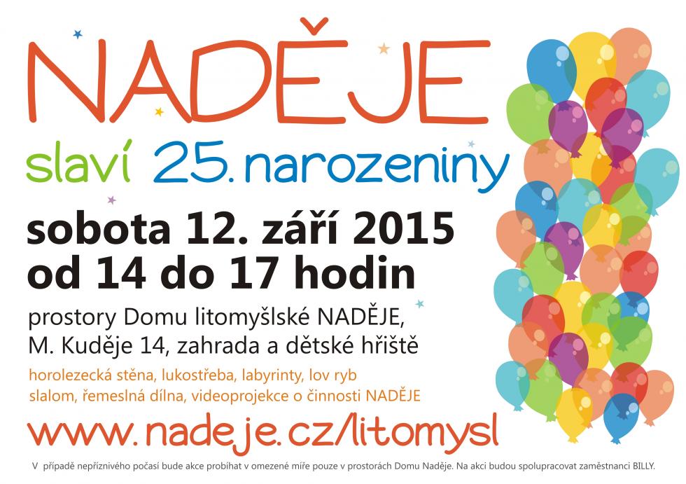 Celorepubliková organizace NADĚJE oslavila 21.8. čtvrt století své působnosti. V Litomyšli se chceme k oslavám s radostí a vděčností z rozvíjející dobré práce připojit. V sobotu 12. 9. od 14 do 17 hodin NADĚJE otevírá dveře široké veřejnosti. Pro děti bude připraven zábavný program. Několik soutěžních stanovišť o ceny a rukodělná dílna. Dospělým nabízíme možnost nahlédnout do vnitřních prostor a zároveň se mohou podívat na průřez práce litomyšlské pobočky na fotografiích nebo z videoprojekce.