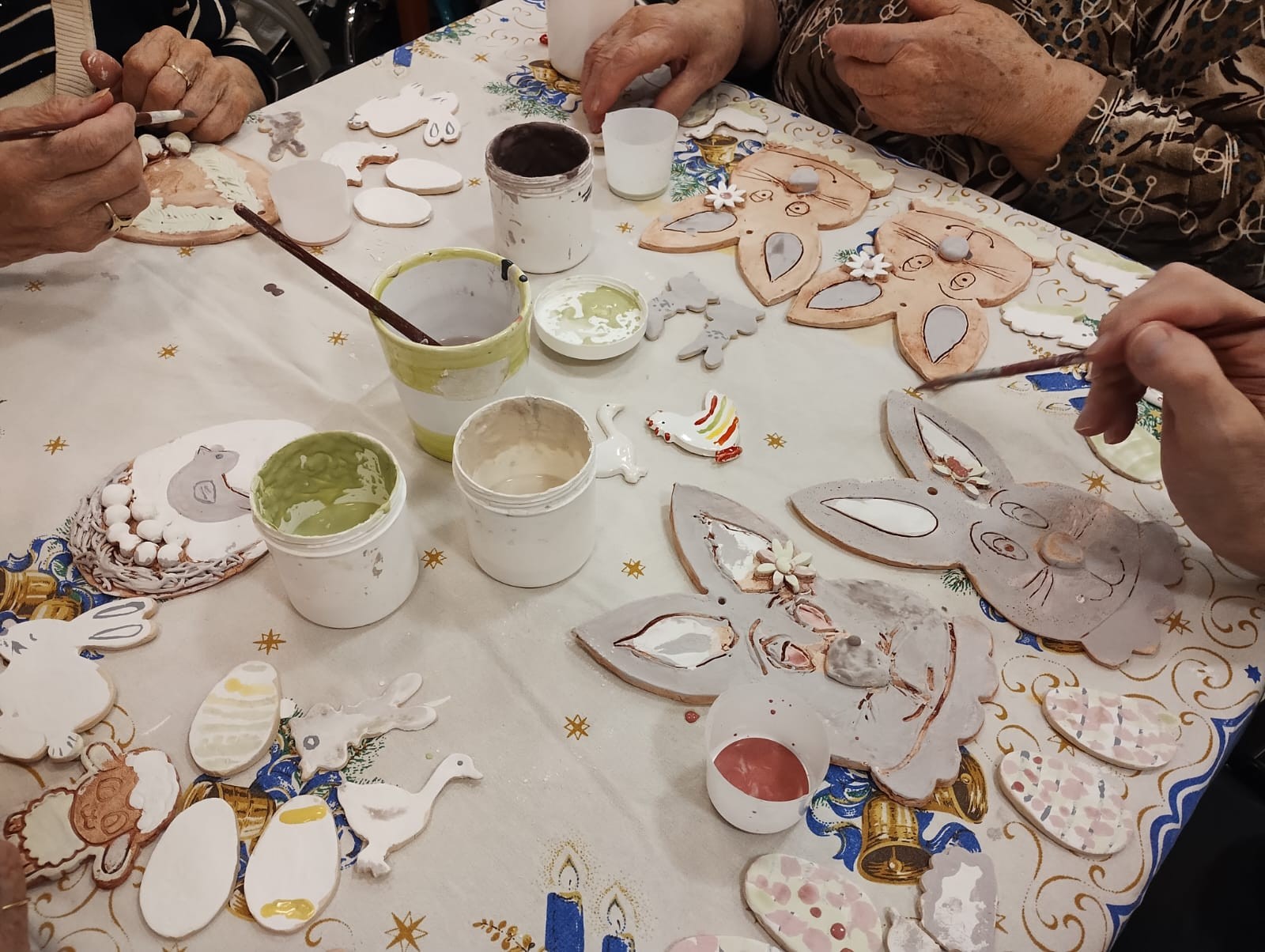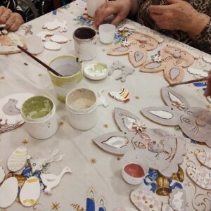 Po dvou týdnech se naše společenská místnost znovu proměnila v útulnou keramickou dílnu. Atmosféru tvořivosti k nám opět přinesly šikovné keramičky z DDM Brumov‑Bylnice, paní Marie Vaško a Martina Lysáková, které zároveň dovezly i první vypálené výrobky našich klientů.