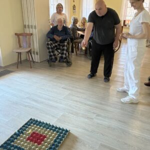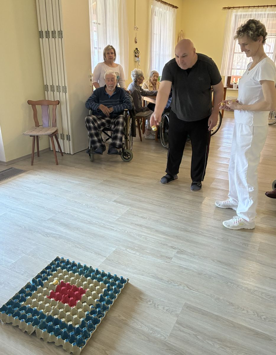 Počasí nám zatím nepřeje k aktivitám venku, a tak jsme se sešli v naší společenské místnosti, kde jsme si užili veselé soutěžní dopoledne. Klienti se rozdělili do dvou týmů a utkali se v házení na terč. Ten byl rozdělen na tři bodované části a každý soutěžící měl čtyři kola na to, aby pro svůj tým získal co nejvíce bodů.