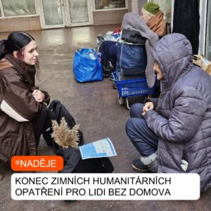 V neděli 31. 3. skončila Zimní humanitární opatření, do kterých jsme už tradičně byli zapojeni od začátku prosince. Naše kolegy a kolegyně jste mohli potkávat každou noc v centru i na periferních Prahy, kde zjišťovali aktuální potřeby lidí bez domova. V zimní útulně v Troji jsme po čtyři měsíce poskytovali nocleh ženám i mužům, kteří chtěli přečkat noc v bezpečí a v teple.