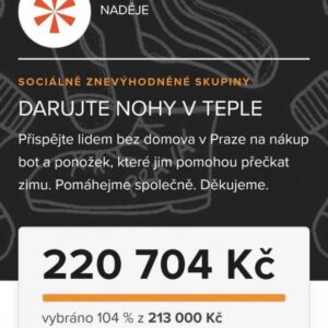 K dnešnímu dni dárci věnovali 35 743 Kč z cílové částky 213 000 Kč, za kterou můžeme nakoupit 1000 párů ponožek a 500 párů bot. Nebo pořídit komplet jednoho páru bot + dvoje ponožky pro 1/3 z počtu 1500 osob bez domova, kterým jsme schopni během zimního období poskytnout službu v denních centrech a na ulici.
