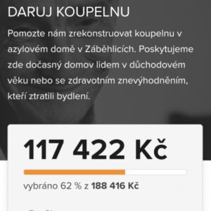 Máme velkou radost – stav sbírky Daruj koupelnu je aktuálně 116 122 Kč ze 188 416 Kč.