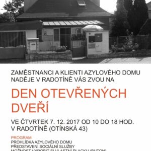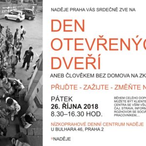 Přijďte a poznejte prostředí, kde lidé bez domova hledají nejen útočiště, ale mohou zde bezpečně přečkat mrazy a vyhledat pomoc odborných pracovníků. Poznejte prostředí denního centra a posuďte sami… jsou to předsudky, nebo je opravdu tak nechutné, špinavé a ponižující? Máte zájem být chvíli naším klientem? Chcete zjistit a zkusit jaký je to pocit, požádat o pomoc a projít krůček po krůčku prvním dnem klienta, který se lusknutím prstu octne na ulici? Nebo jste jedni z těch, kterým se to nemůže stát? Ochutnejte čaj, jídlo, popovídejte si se sociálním pracovníkem. Staňte se na půl dne klientem nízkoprahového denního centra se vším všudy. V pátek 26. října v době od 8.30 do 12.00 bude středisko plně k dispozici lidem, kteří chtějí zjistit více o naší práci a na vlastní kůži prožít pár chvil v centru, kde se denně vystřídá 180 lidí bez domova. V tuto dobu nebudou na středisku přítomni klienti. Středisko bude otevřeno pouze pro veřejnost. Využijte tedy jedinečnou možnost a poznejte prostředí, kde se každý den reálně odehrávají desítky životních příběhů. Těšíme se na Vás!