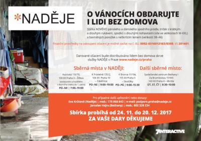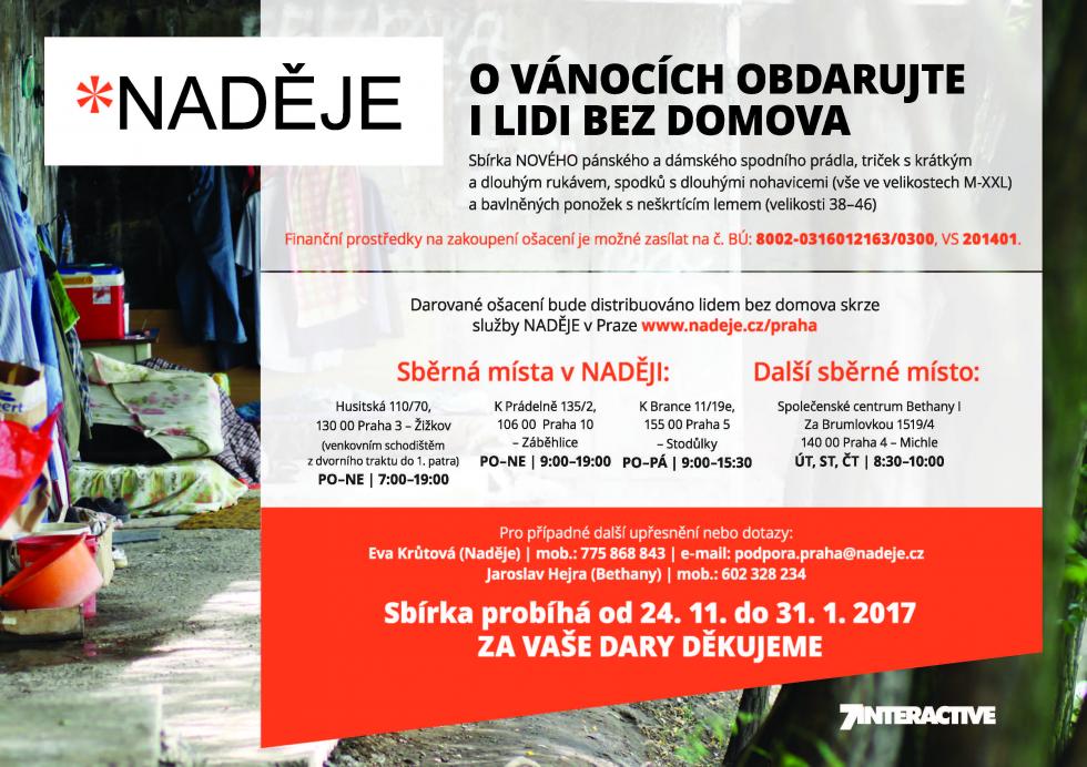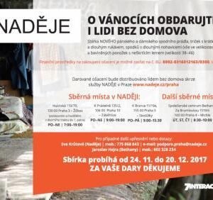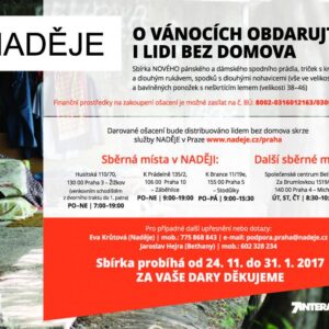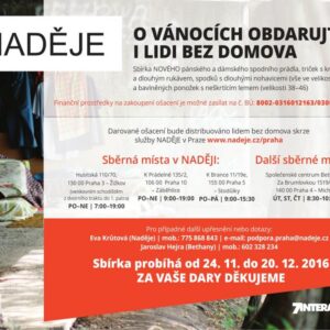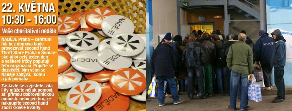 Přijďte v neděli, 22. května, od 10:30 do 16:00 hodin do Prague Thrift Store, Šumavská 29, Praha 2. Máme ho k dispozici, budeme zde prodávat kvalitní second hand zboží a prezentovat naše služby pro lidi bez domova. Vy si budete moci nakoupit pěkné věci, a na pomoc lidem bez domova tak bezprostředně přispět. Výtěžek z prodeje totiž obdrží NADĚJE na úhrady jízdného pro klienty do místa jejich trvalého bydliště.