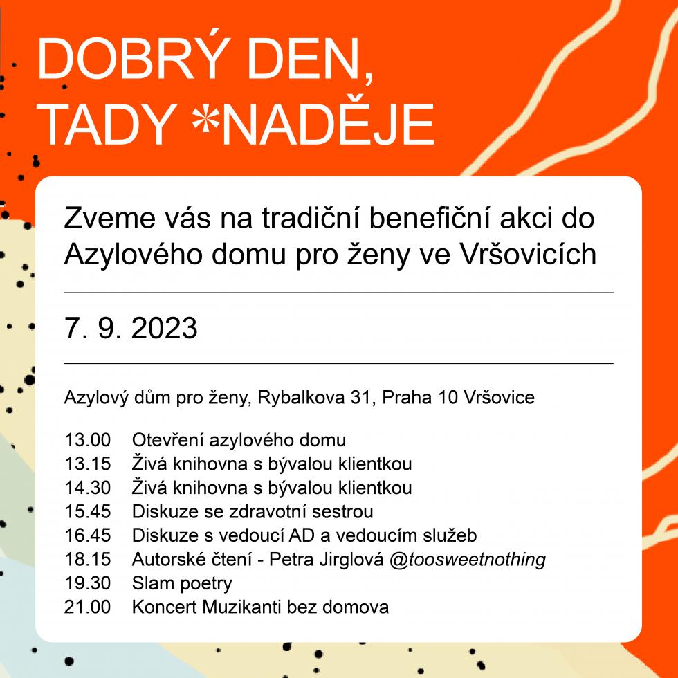 Budeme moc rádi, když přijmete pozvání na tradiční benefiční akci Dobrý den, tady NADĚJE, kterou organizují naše „Holky z Vršek“. Těšit se můžete na tento parádní program, který bude vážný i nevážný. Věříme, že každý si najde to své. Ať už to jsou diskuze s bývalými klientkami azylového domu formou „živých knihoven“, černý humor v podání slam poetristů nebo koncert Muzikantů bez domova, kteří budou jako vždy skvělí a autentičtí.