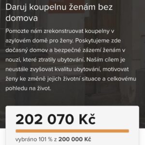 Máme opravdu velkou radost, že se s Vámi můžeme podělit o výsledek kampaně Daruj koupelnu ženám bez domova. Společně se nám podařilo vybrat více než 100 % cílové částky, konkrétně skvělých 202 070 Kč.