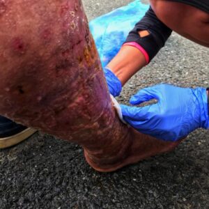 Václav (51 let) žil po smrti otce zhruba tři roky na ulici. Začátkem července byl kontaktován našim terénním týmem. Zdravotní sestra zjistila rozsáhlá otevřená hnisavá ložiska na obou nohou včetně defektu na plosce. Ošetření bylo možné jen v ordinaci. Václav byl navíc v silně zanedbaném hygienickém stavu bez jakýchkoliv dokladů. Byl tedy objednán na druhý den do ordinace. Sem ale dorazil o několik dní později. Jeho stav se mezitím zhoršil. Ordinace zajistila komplexní vyšetření, včetně žádanek na další odborná vyšetření, antibiotika, léky na cukrovku, převaz a ubytování v humanitárním zařízení. Mezitím sociální pracovnice požádala o číslo pojištěnce a zajistila rodný list. S těmito doklady a doprovodem byla odborná vyšetření provedena. Začátkem srpna je Václav stále ubytovaný v humanitárním zařízení a jeho zdravotní stav se zlepšuje i díky pravidelným převazům a kontrolám v ordinaci.