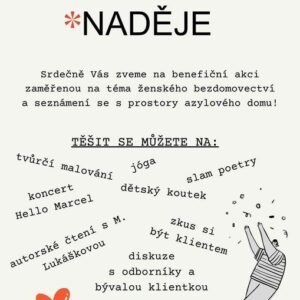Srdečně vás zveme na benefiční a edukační akci o ženském bezdomovectví v prostorách našeho azylového domu NADĚJE ve Vršovicích.