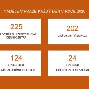 Mobilní sociální služba je součástí našeho terénního programu takovou dobu, že už si to bez ní ani nedokážeme představit. Nabízí materiální a potravinovou pomoc, ale také třeba zdravotnickou péči za přítomnosti zdravotní sestřičky nebo zdravotníka. Jen za loňský rok jsme pravidelně navštěvovali 19 míst v 8 městských částech. Na těchto místech jsme zajistili 21 245 kontaktů a na každé místo přišlo v průměru 34 lidí. V 1 428 případech kolegové pomáhali řešit lidem bez domova jejich zdravotní stav. Více informací nejen o naší mobilce, ale také třeba o tom, co dělat, když najdete člověka bez domova, kterému chcete pomoct, si přečtete na našem webu https://nadeje.cz/praha/phpomocvulicich.