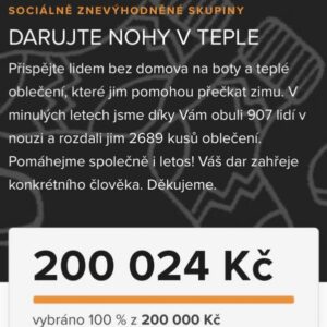 Moc vám všem děkujeme milí dárci! Konečný výsledek sbírky DARUJTE NOHY V TEPLE je 223 724 Kč. Společně jsme lidem bez domova v Praze předali 302 párů zimních bot, 306 kusů oblečení, 20 kusů Heatshield Bag (žďáráků). Boty a oblečení putují hlavně lidem, kteří navštěvují naše dvě denní centra a také těm, které oslovíme v rámci našeho terénního programu.