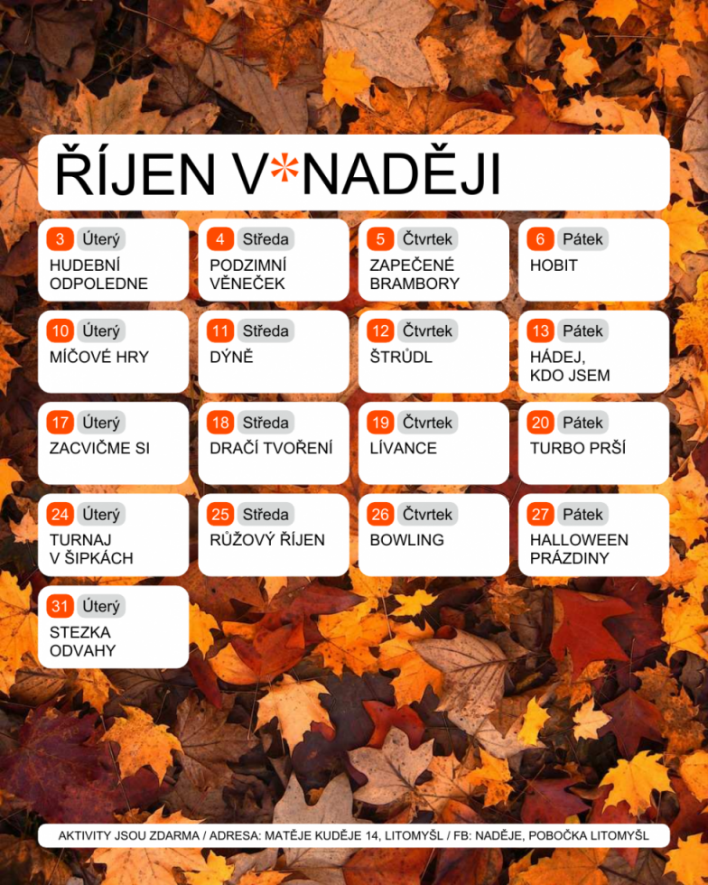 Říjen už je tady a s ním i náš měsíční program. Čekají nás jako vždy pohybové hry jako zacvičme si, turnaj v šipkách nebo míčové hry. Také si uvaříme lívance nebo zapečené brambory. Budeme si povídat o tom, proč se říká růžový říjen. Na konci měsíce budou Halloweenské podzimní prázdniny. Půjdeme na bowling, vydlabeme si dýně a čeká nás také stezka odvahy.