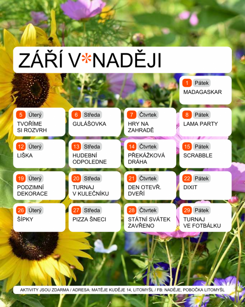 Začal nám nový měsíc a to znamená, že pro vás máme nachystaný nový program. V září nás čeká hudební odpoledne, překážková dráha, turnaj v kulečníku, podzimní tvoření, den otevřených dveří a mnoho dalšího.