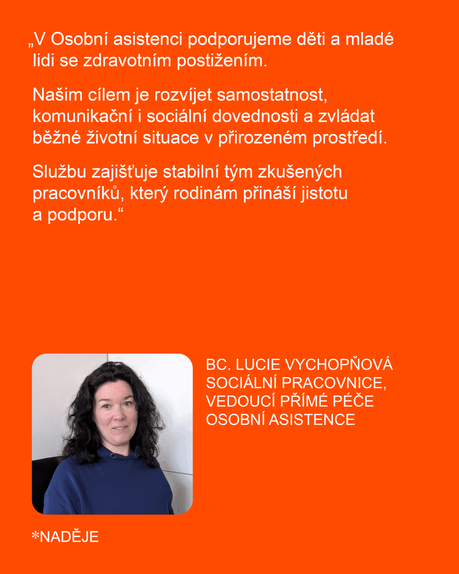 Právě v takových chvílích je tu Osobní asistence. Stojíme po boku dětem a mladým lidem se zdravotním postižením a podporujeme je v tom, aby zvládali běžné situace co nejvíce samostatně. A rodinám dáváme prostor si odpočinout, pracovat nebo být chvíli „jen“ spolu.