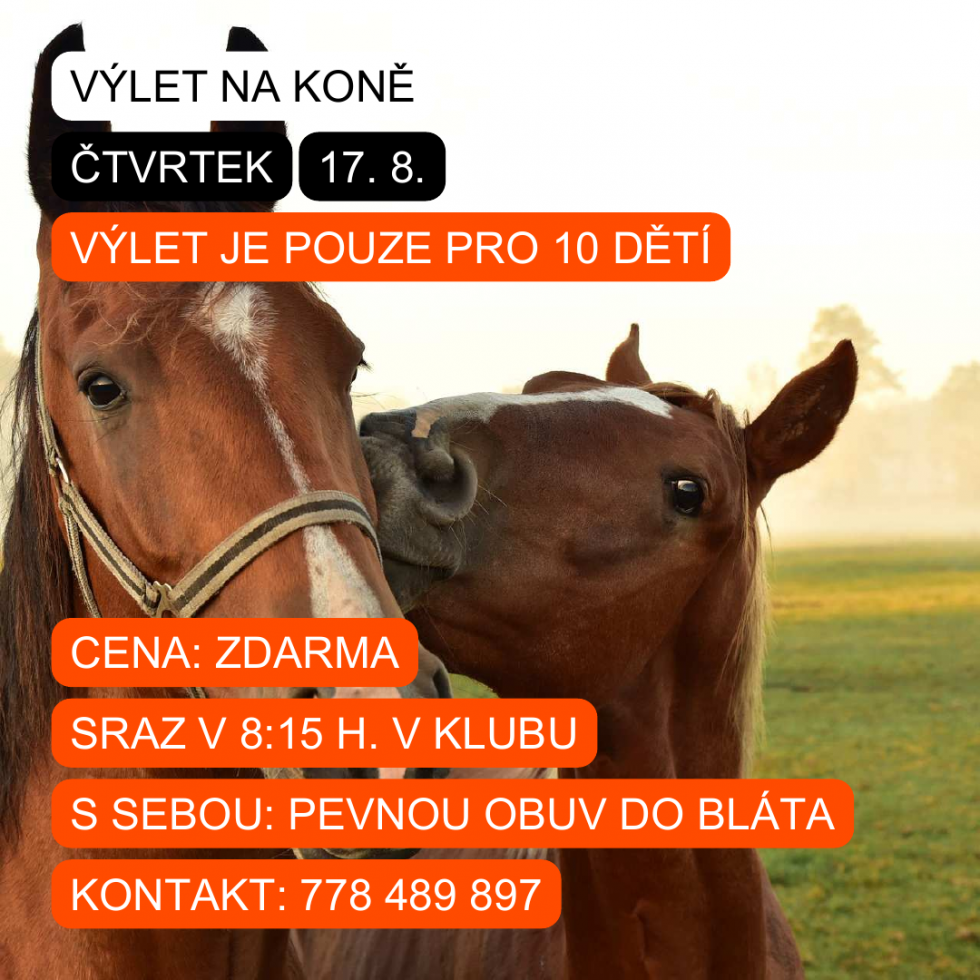 Ve čtvrtek 17. srpna pojedeme na koně. Výlet je zdarma, ale je omezená kapacita na 10 dětí. S sebou si vemte pevnou obuv do bláta, svačinu a pití.