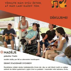 Hudba nás provází po celý život. Umí nám zvednout náladu, uklidnit i povzbudit. Významnou roli hraje i v životě lidí s mentálním a kombinovaným postižením, kterým pomáháme v denním stacionáři Naděje ve Vsetíně. Při práci s klienty využíváme techniky založené na muzikoterapii, která má pozitivní vliv na rozvoj klientů. Pracujeme s prožitkem zvuků a rytmů a k tomu využíváme různé hudební nástroje. Tyto aktivity pomáhají našim klientům uvolnit emoce, zlepšit komunikaci i vztahy. S Vaší pomocí pořídíme potřebné hudební nástroje a zajistíme vzdělání zaměřené na muzikoterapii pro pracovníka služby.