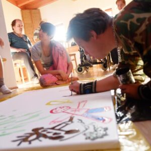 Odpoledne jsme v produktivní arteterapii, kterou vedla Petra Filáková, mohli na malířském plátně popustit uzdu svým fantaziím. To, co každý díky spontánností sobě vlastní vytvořil, jsme začlenili do jednoho celku. Vznikl tak obraz barevný, různorodý, v každém případě zajímavý. Zkrátka takový, jací v terapeutické dílně jsme. A večer? Ten patřil příjemnému odpočinku a společnému posezení u táboráku.