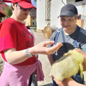 Pro naše klienty bylo připraveno svělé občerstvení a poutavá prohlídka místní farmy. Měli jsme možnost vidět kuřátka, ovce, housata a dokonce i třítýdenní hříbě. Největší radost nám však přineslo, že jsme si mohli tato zvířátka pohladit a ty menší dokonce vzít i do ruky.