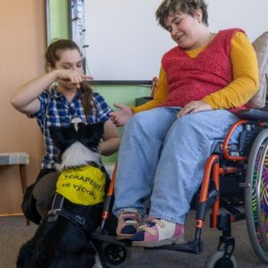 A právě takto vypadal jeden z letních dnů v denním stacionáři na Sychrově, když nás navštívil canisterapeutický pes. Získal si přízeň našich klientů a přinesl jim obrovskou dávku radosti a pohody. Canisterapie přispěla ke snížení stresu a zvýšení motivace k zapojení klientů do dalších činností.