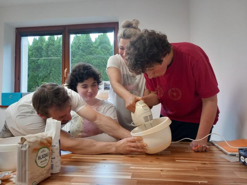 Pečení v denním stacionáři Rybníky je vždy velká zábava. Kolik lidí je potřeba ke šlehání těsta na sušenky? No, podle nás