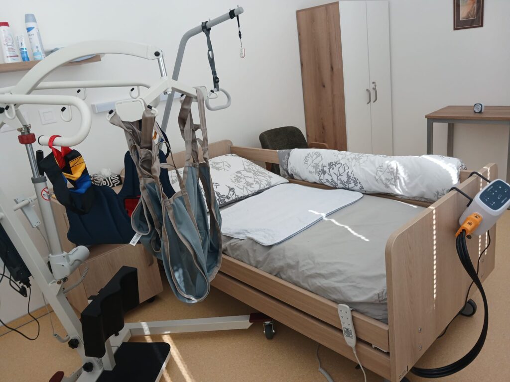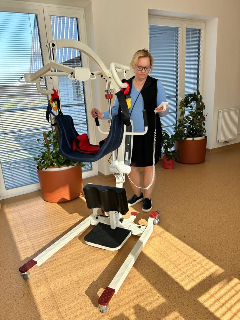 2 kusy elektrických zvedáků Tytan: Tyto zvedáky představují neocenitelného pomocníka pro naše pečovatele. Umožňují bezpečný a šetrný přesun klientů (například z lůžka do vozíku či křesla), aniž by docházelo k fyzickému přetěžování personálu. Pro klienty je tento způsob manipulace mnohem klidnější a důstojnější.