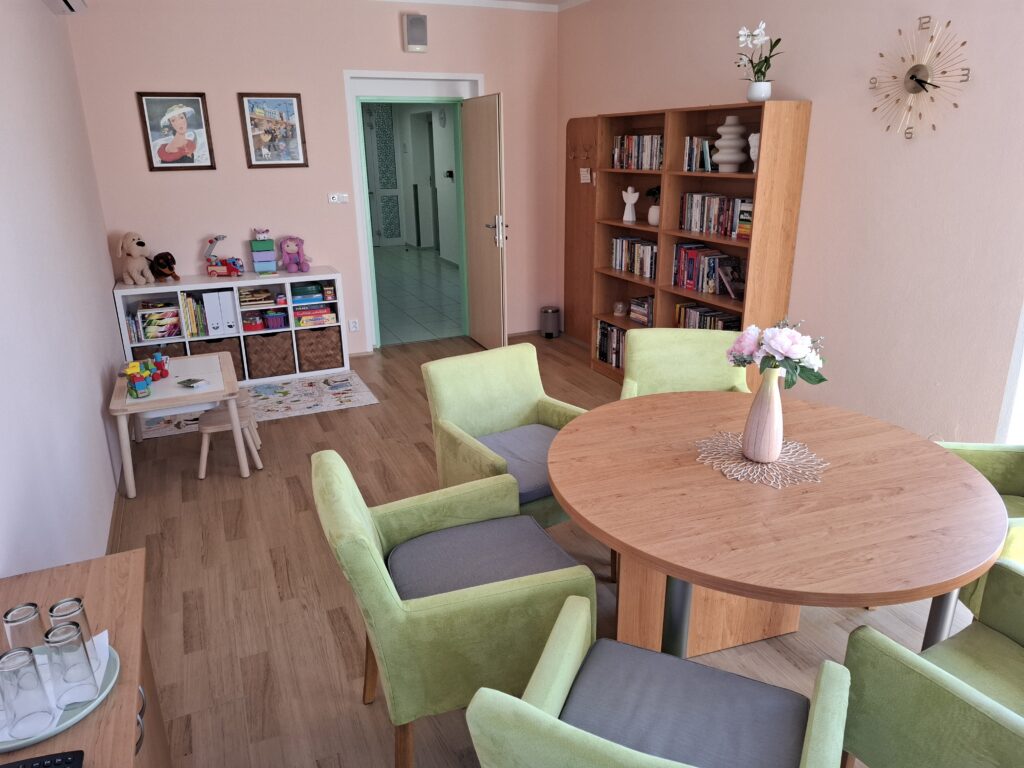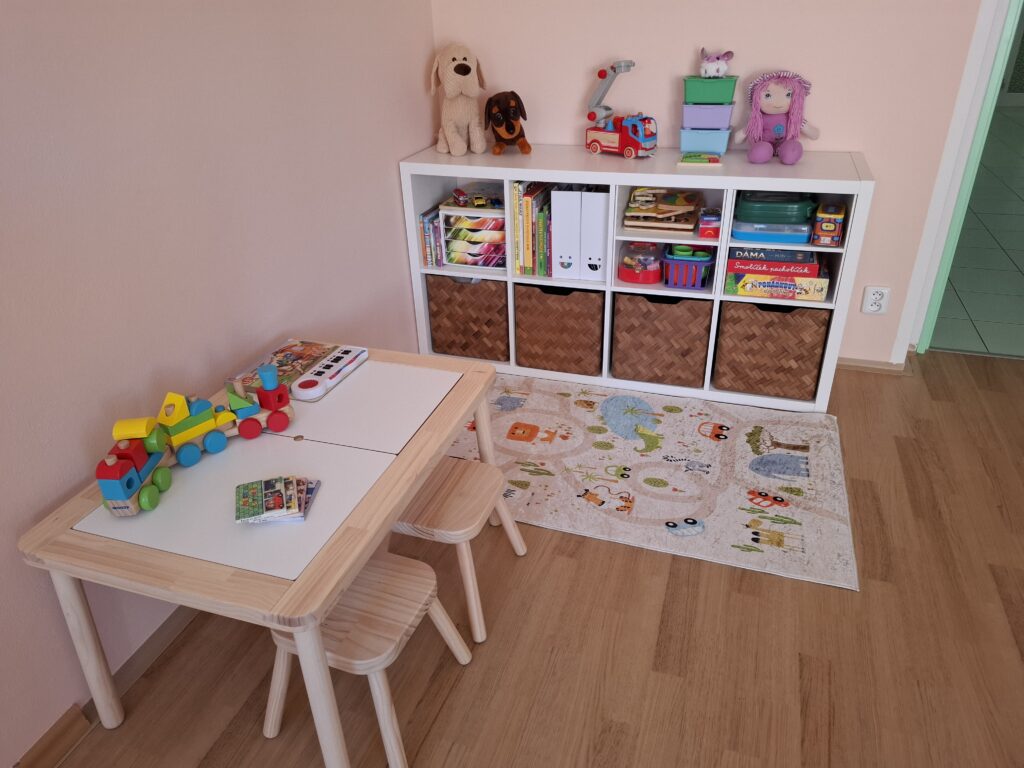 Při přípravě prostoru jsme mysleli na všechny generace. Aby se u nás cítila dobře i vnoučata a pravnoučata našich klientů, vybudovali jsme v pokoji dětský koutek. Ten je vybaven hračkami pro kluky i holčičky – od stavebnic, autíček a panenek až po knížky, skládačky či společenské hry pro ty starší.