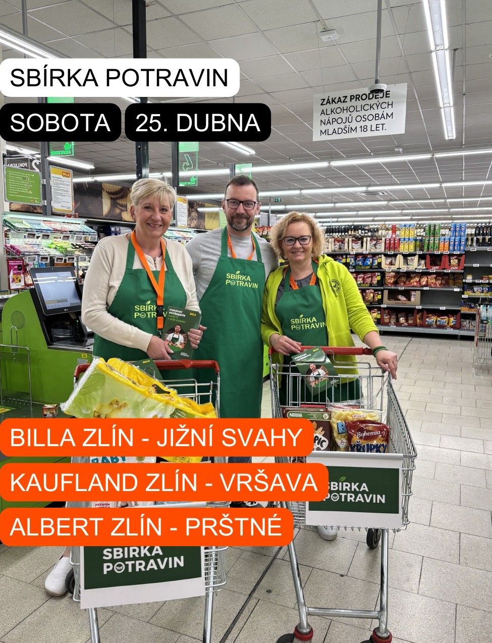 Přijďte v sobotu 25. dubna 2026 podpořit lidi v nouzi. V čase od 8:00 do 18:00 na vás budou v prodejnách Kaufland Vršava, Billa Jižní Svahy a Albert Prštné čekat dobrovolníci z NADĚJE, pobočky Zlín, kteří od vás s vděčností převezmou trvanlivé potraviny i drogerii pro lidi v nouzi v našem regionu.
