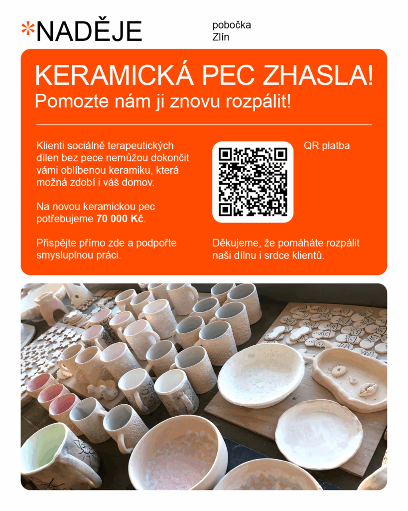 V našich sociálně terapeutických dílnách neutichá pracovní ruch. Pod rukama klientů stále vznikají nové misky, andělé a hrnečky, do kterých vkládají svůj čas, trpělivost i kus sebe sama. Jeden zásadní prvek tu ale chybí – teplo keramické pece. Ta naše po letech intenzivního provozu definitivně dosloužila a bez ní zůstává veškerá tato snaha jen v půli cesty.