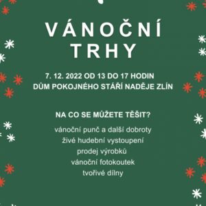 Ve středu 7. prosince od 13 do 17 hodin u nás proběhnou vánoční trhy v Domě pokojného stáří Naděje Zlín. Těšit se můžete na živá hudební vystoupení, punč a další dobroty, prodej výrobků nejen z našich sociálně terapeutických dílen a bohatý doprovodný program.