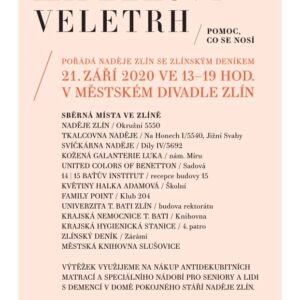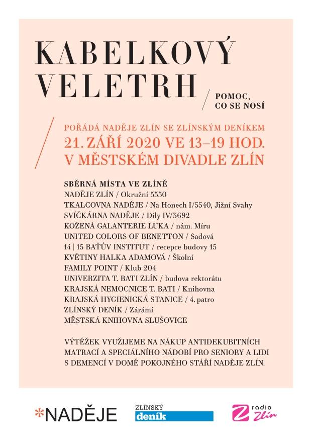 Oblíbená benefiční akce Kabelkový VELEtrh se přesunula z jara na nový termín 21. 9. 2020. Ve sběrných místech opět máte možnost odevzdat kabelky. Tyto vystavíme v daný termín v Městském divadle Zlín a výtěžek proměníme v antidekubitní matrace a speciální nádobí pro seniory a lidi s demencí v Domě pokojného stáří NADĚJE Zlín.