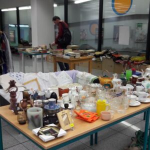 První den, měsíce sbírání a třídění věcí za námi, hlouček, který se tvoří před dveřmi místnosti, kde se bazar koná ještě před otevřením! Oblečení, porcelán, plyšové hračky, knihy, kabeleky a spoustu dalšího připraveno. Zaměstnanci odhodlaní prodat vše a pomoci tak seniorům a lidem s Alzheimerovou nemocí, o které se staráme.