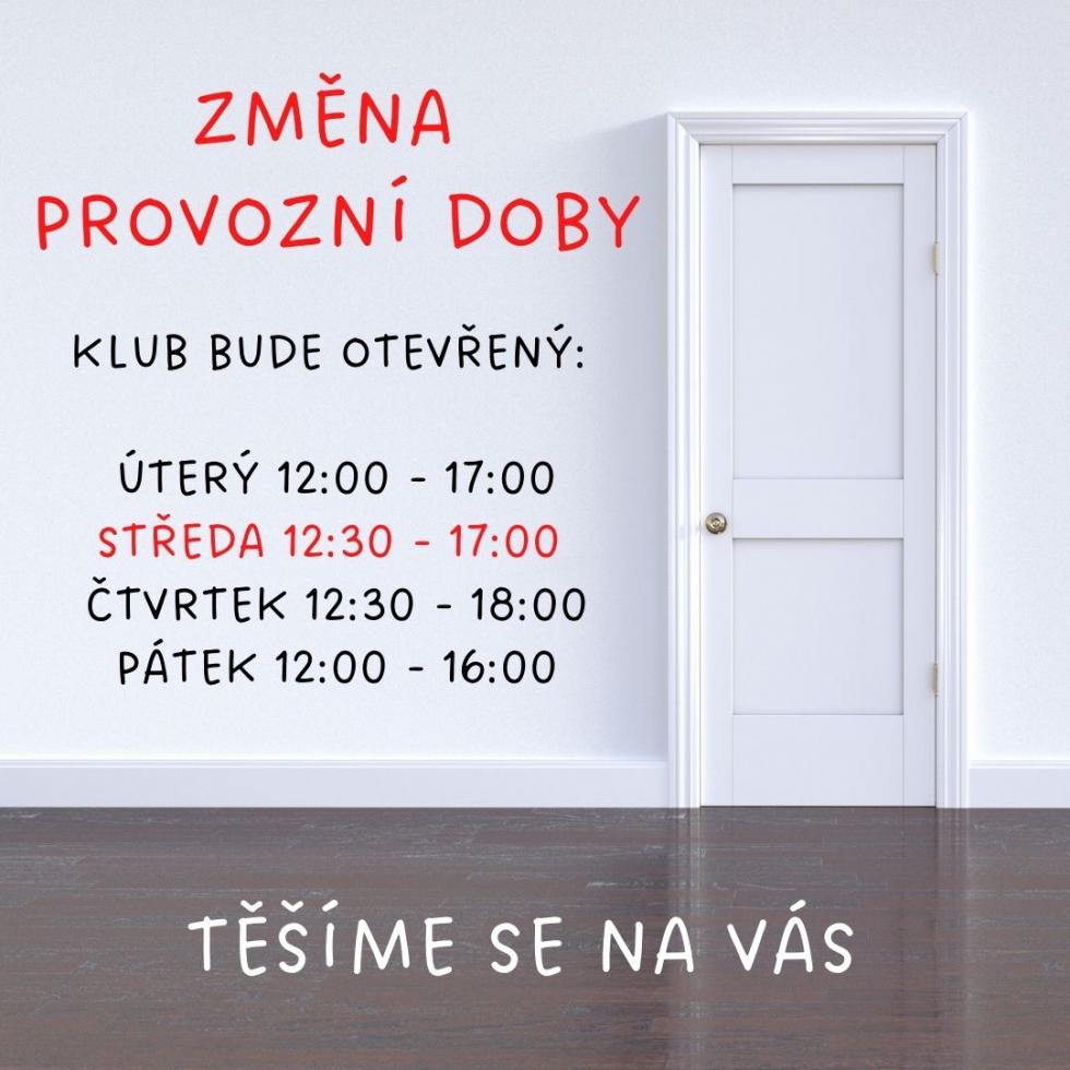 Ve středu 6. dubna bude klub z provozních důvodů otevřený pouze do 17:00 hodin.  Zbytek týdne bude klub otevřený ve standartním režimu jak jste zvyklí. Děkujeme za pochopení.